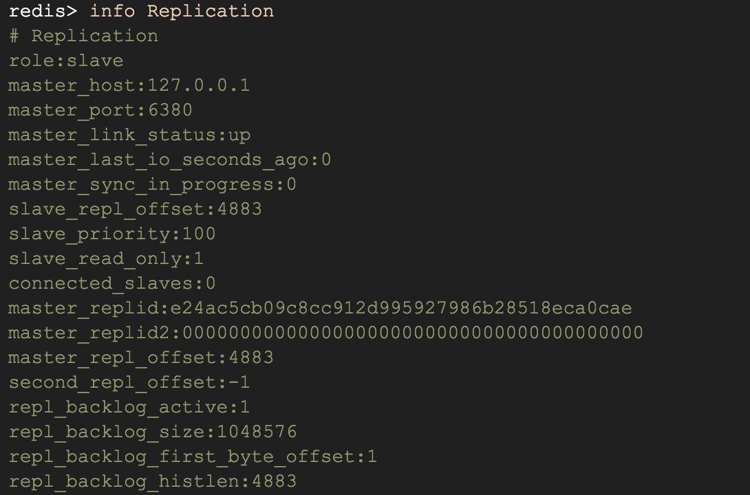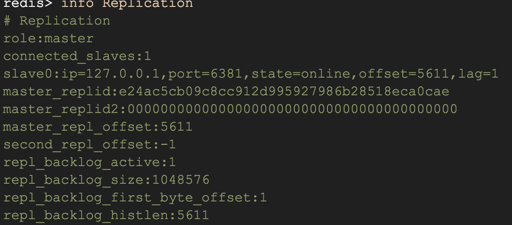 可以通过info Replication命令查看主从状态,下图分别为主节点和从节点信息
