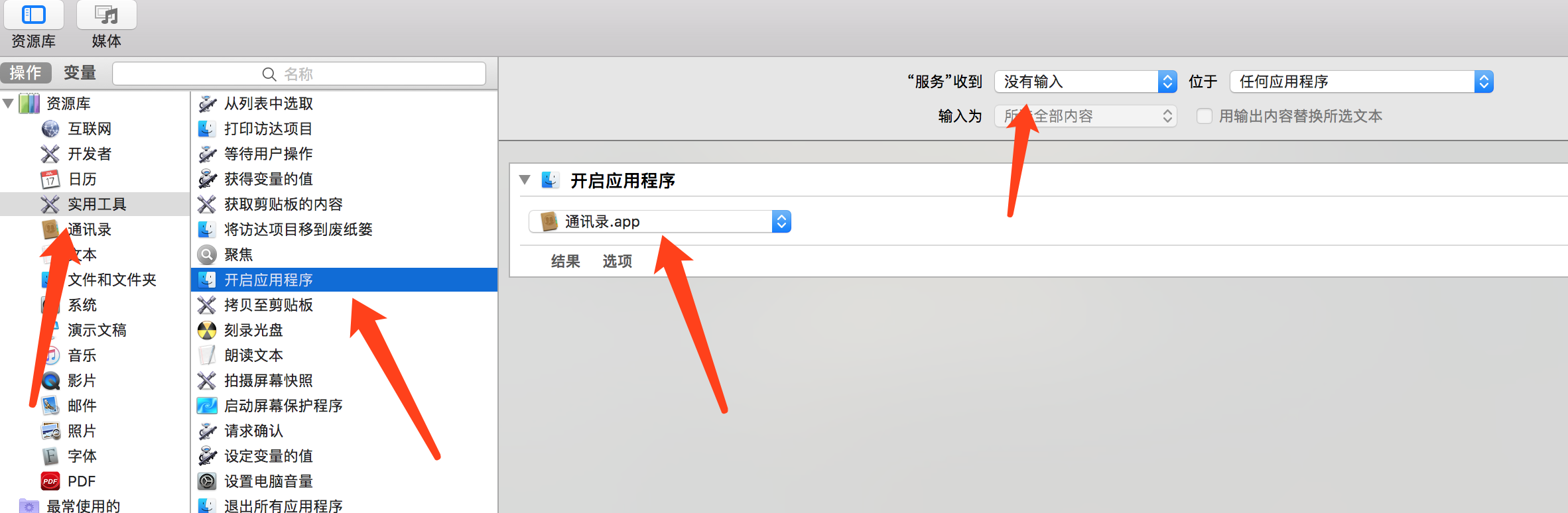 选择“服务”,依次选择“实用工具”、“开启应用程序”、服务收到选择“没有输入”、选择要开启的应用程序